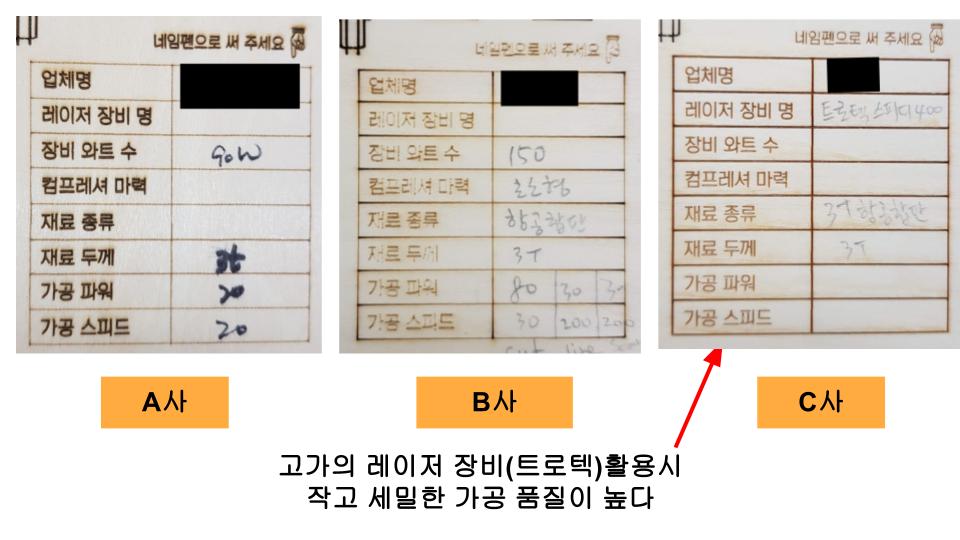 고가의 레이저 장비(트로텍)활용시 작고 세밀한 가공 품질이 높다