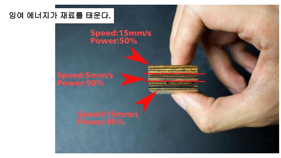 - 재료와 베드 사이에 종이를 까는 등의 방법으로 back burn을 줄인다.